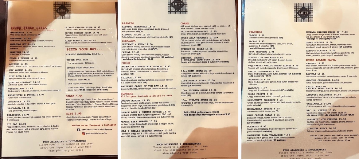 Experience the vibrant atmosphere at Gattos Restaurant in Ballymena, where delicious pizzas, tender steaks, and gluten-free options await. Enjoy our affordable menu and indulge in our famous dessert platter. Perfect for dinner or takeout! Call +44 28 2565 3444 to reserve your table today!